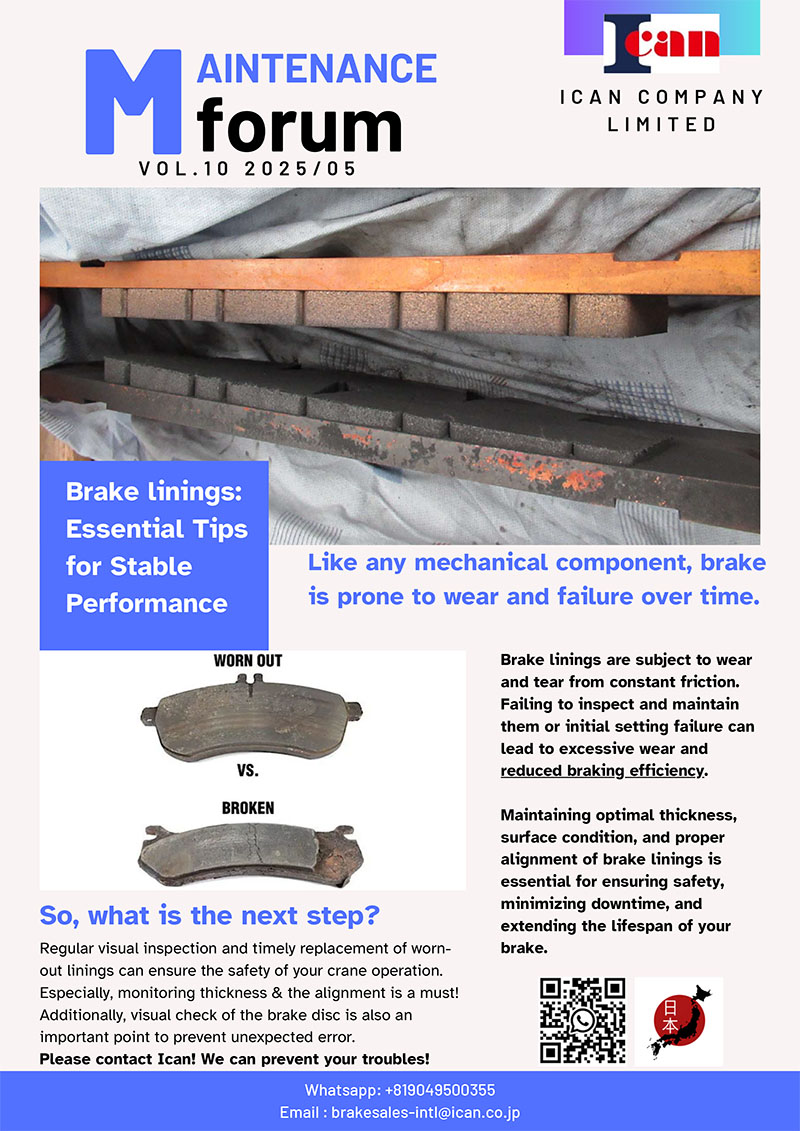 Trong nhiều trường hợp, hiệu suất phanh suy giảm không chỉ do má phanh bị mòn mà còn do lỗi lắp đặt hoặc căn chỉnh ban đầu chưa chính xác. Điều này dẫn đến mòn lệch, rung lắc hoặc lực phanh không đều, gây mất an toàn trong vận hành. Chúng tôi nhấn mạnh tầm quan trọng của việc căn chỉnh đúng kỹ thuật khi lắp đặt ban đầu. Chúng tôi sẵn sàng hỗ trợ tư vấn kỹ thuật hoặc kiểm tra thực địa để đảm bảo hệ thống phanh ICAN hoạt động ổn định và hiệu quả nhất từ những ngày đầu tiên.